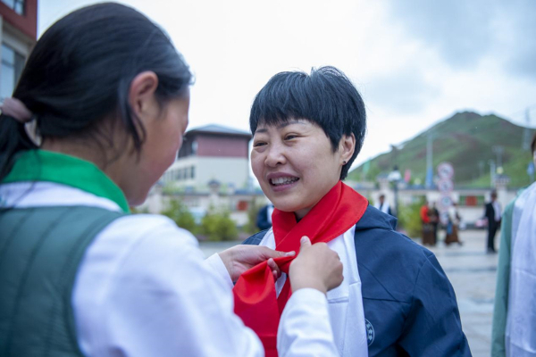 11日上午,医护团队和志愿者来到了丁青县实验小学,老师们为医护人员献上了哈达,学生们则为医护人员戴上红领巾。